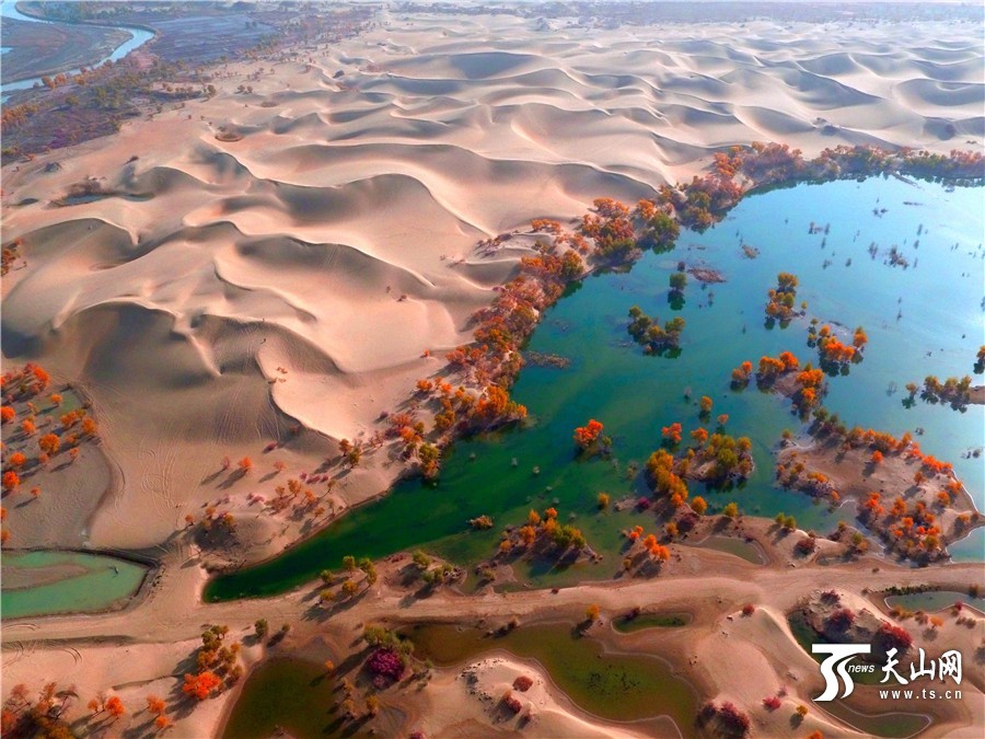 航拍下的胡杨金黄树叶色动人。
