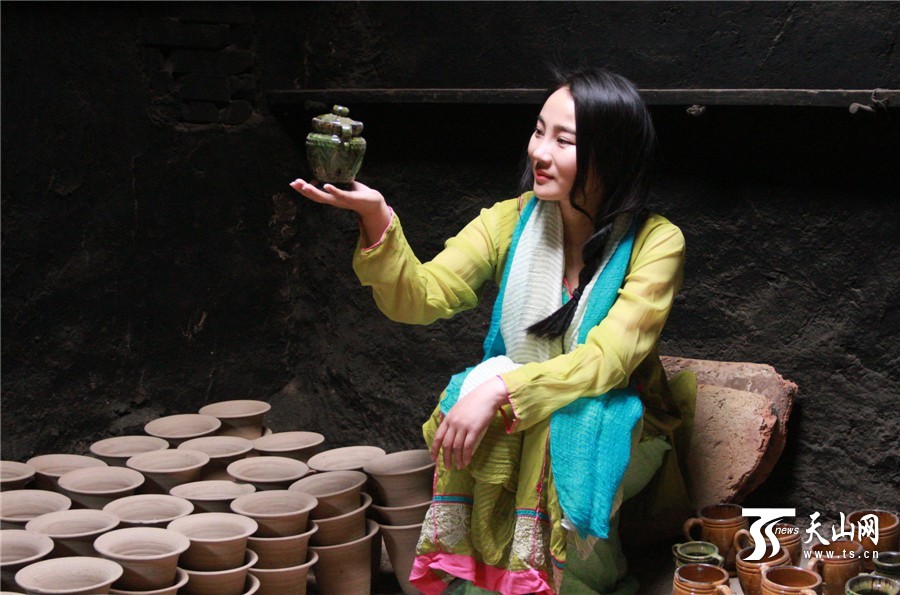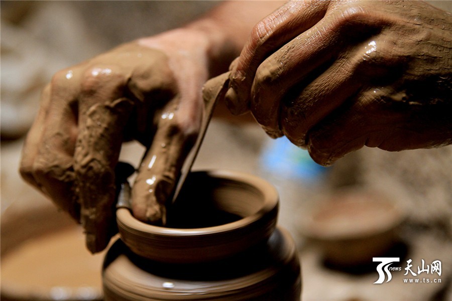 第六代土陶艺人吾麦尔·艾力在制作陶坯