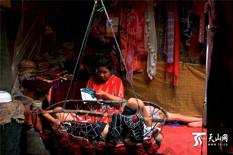 喀什老城中的一位妈妈在孩子熟睡时做着刺绣