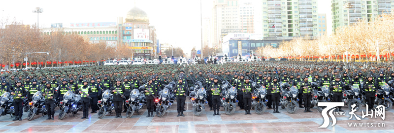 参加誓师大会的全体公安干警、武警官兵整装待发。(新疆日报记者卢民一 阿扎提?玉素甫江摄)