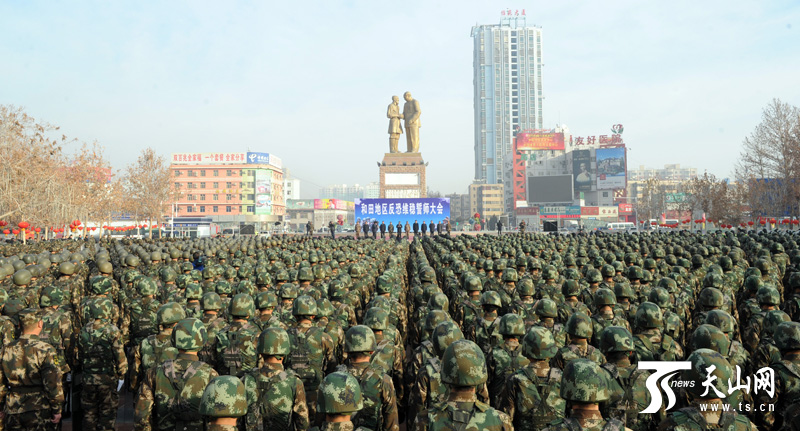 2月16日,“扬威震慑 武装拉动”自治区反恐维稳誓师大会在和田举行。(新疆日报记者卢民一 阿扎提?玉素甫江摄)