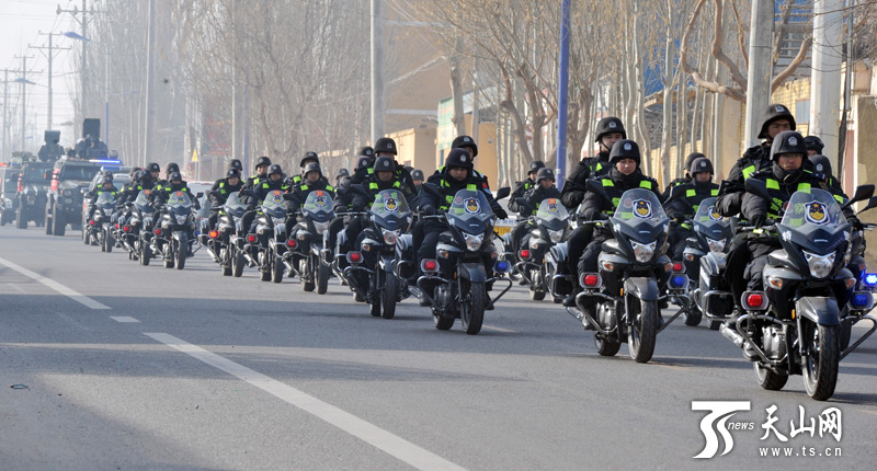 参加誓师大会的全体公安干警、武警官兵向任务区进发。(新疆日报记者卢民一 阿扎提?玉素甫江摄)