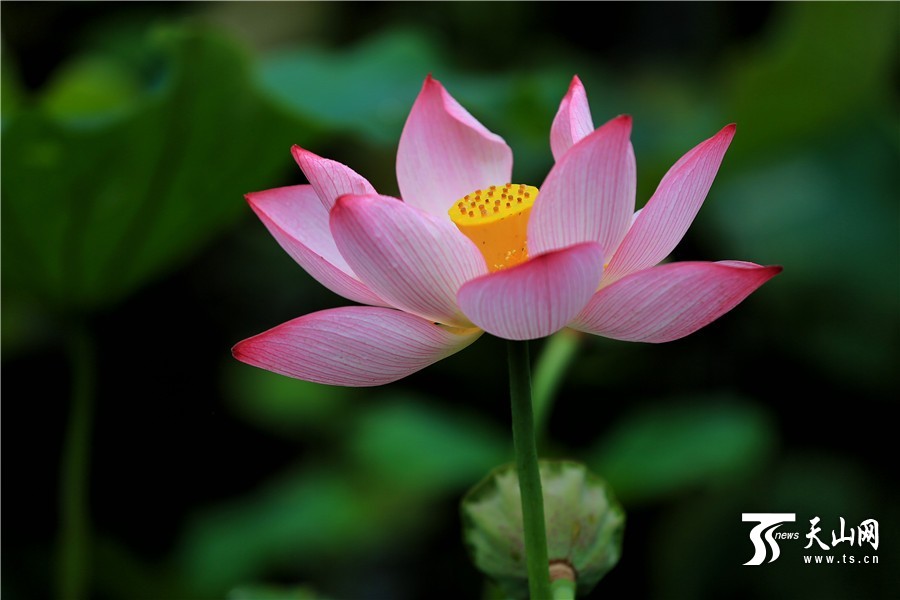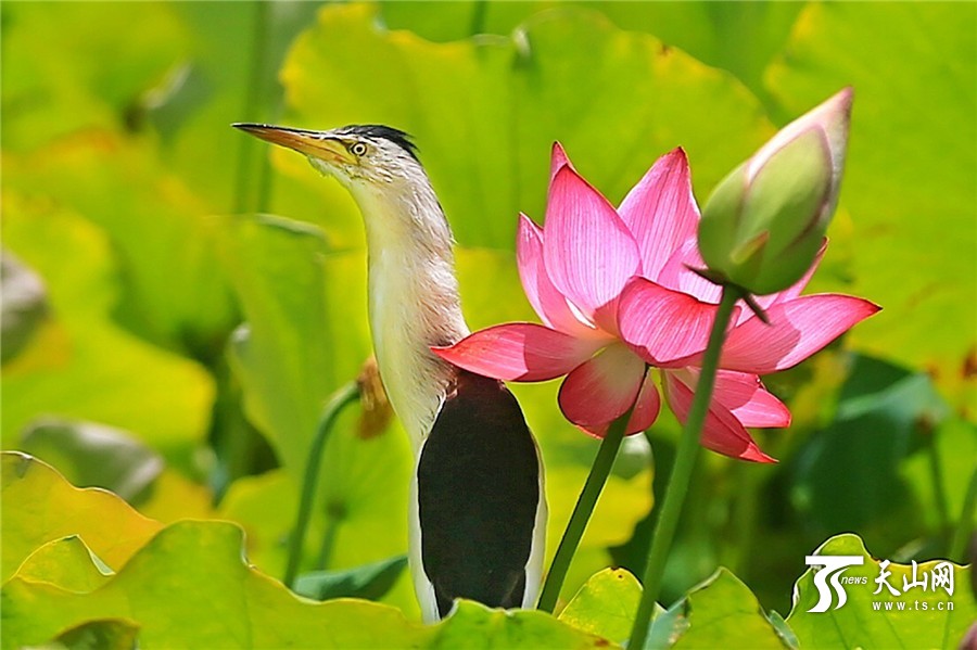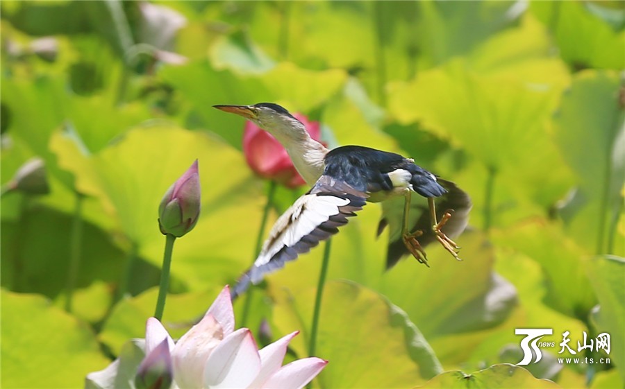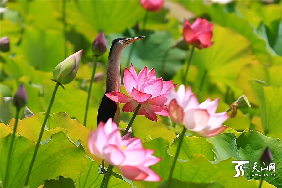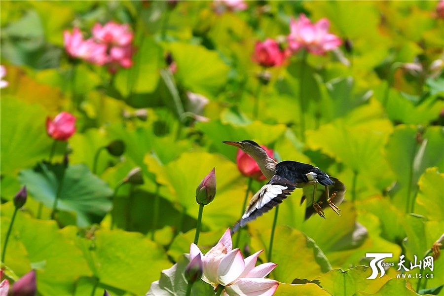 7月13日,一只夜鹭在新疆焉耆县相思湖景区的荷花塘里栖息。近日,相思湖的荷花竞相开放,艳丽的花朵和各类水鸟相映成趣,构成一幅绚丽的风景图画。