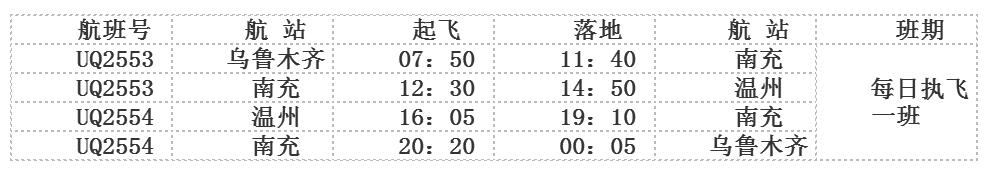 乌鲁木齐-南充-温州航线将于2月1日开通,每日执飞一班。乌鲁木齐始发航班号为UQ2553,07:50由乌鲁木齐地窝堡国际机场起飞,11:40抵达南充高坪机场,12:30由南充高坪机场起飞,14:50抵达温州龙湾国际机场;温州始发航班号为UQ2554,16:05由温州龙湾国际机场起飞,19:10抵达南充高坪机场,20:20由南充高坪机场起飞,00:05抵达乌鲁木齐地窝堡国际机场。